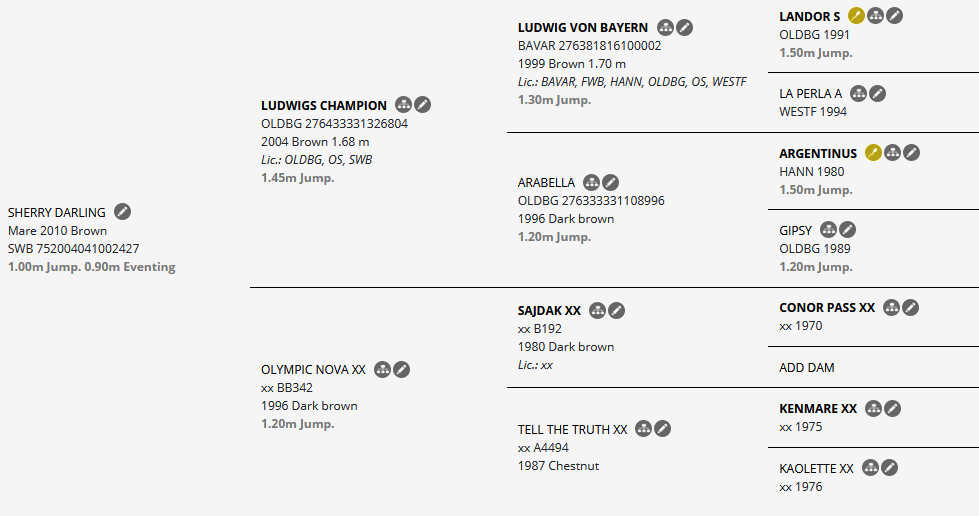 - Importerad från Tyskland som unghäst där hon innan gick unghästklasser. Registrerad i Westfalen och tilläggsregistrerad i ASVH. Tävlad upp till 125 cm med vinster upp till 120 cm. Efter skada gick hon i aveln. Fått 5 föl, 2 premierade, 2 äldsta hittills debuterat på tävlingsbanan upp till 90 cm med vinster.